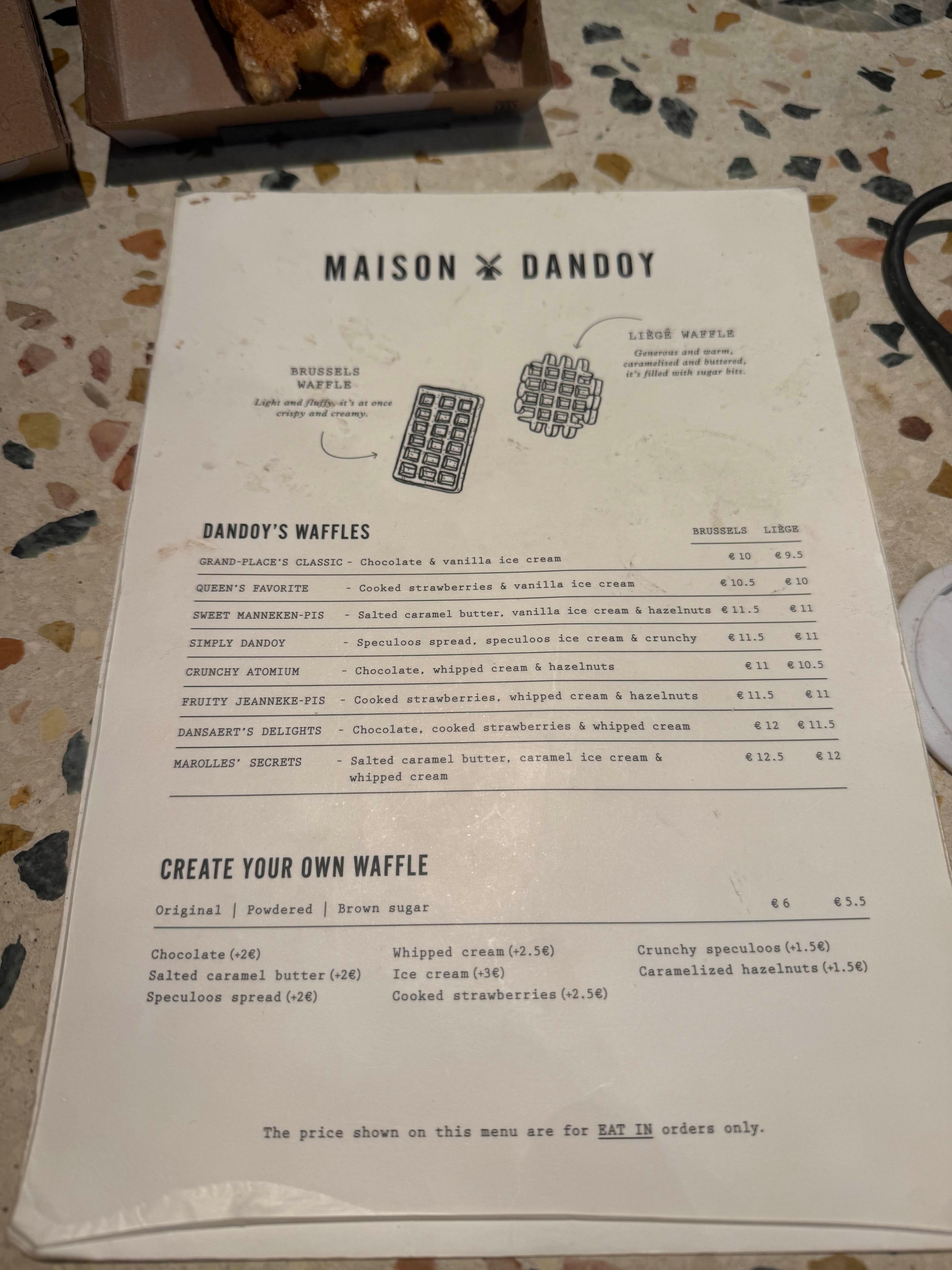 초콜렛을 사고 나와서 돌아다니다보니 어디서 많이 본 입간판이 있어서 보니까 여기가 그 유명한 벨지엄 프라이 맛집이란다. 마수걸이까진 아니었고 앞에 현지인 둘이 감자튀김을 기다리고, 내가 두번째 손님인 듯했다. 안달루즈 소스를 많이 먹던데 나는 아이올리 소스로 시켰다. 작은데도 양이 많다 해놓고 광장에 앉아서 와작와작 다 먹었다.
